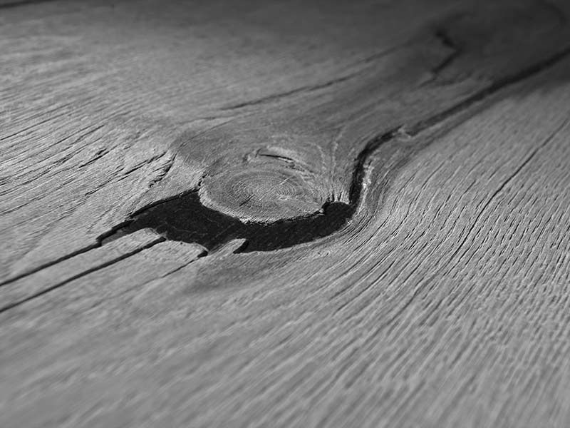 Beidseitig 0,9 mm Furnier Eiche grau verwittert, Trägerplatte: 18 mm MDF schwarz gebeizt, A-Seite: gebürstet, wie gemessert mit natürlichem Balkenübergängen auf Trägerplatte aufgebracht, B-Seite: geschliffen, gesäumt, traditionell auf Trägerplatte aufgebracht